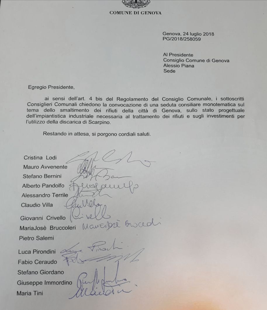 Genova – Parte da un’iniziativa di Cristina Lodi, capogruppo PD in Consiglio Comunale, la raccolta firme presentata oggi al Presidente del Consiglio Comunale, Alessio Piana, con la richiesta per una seduta consiliare monotematica sul “caso Scarpino”.