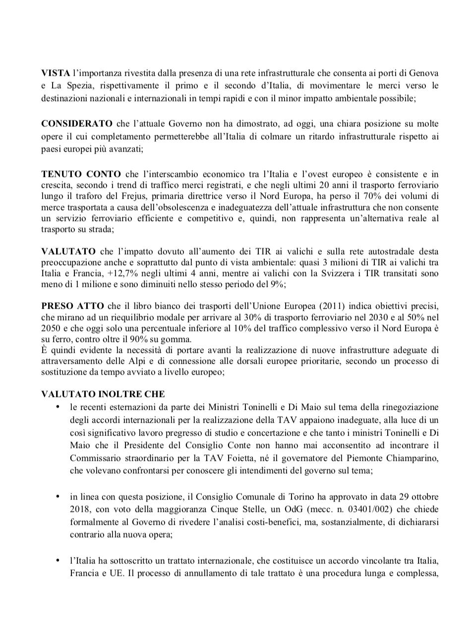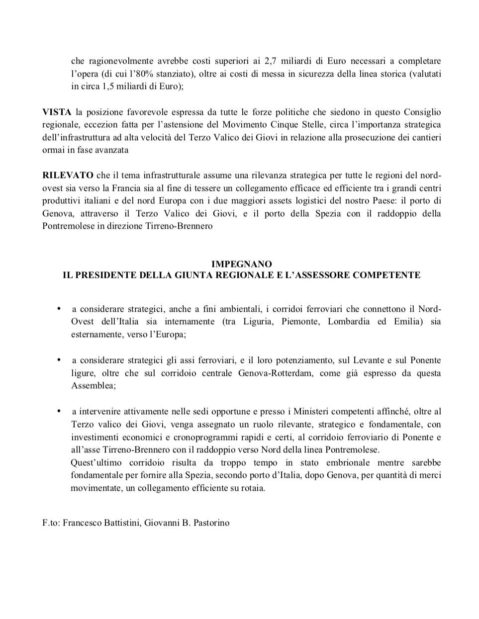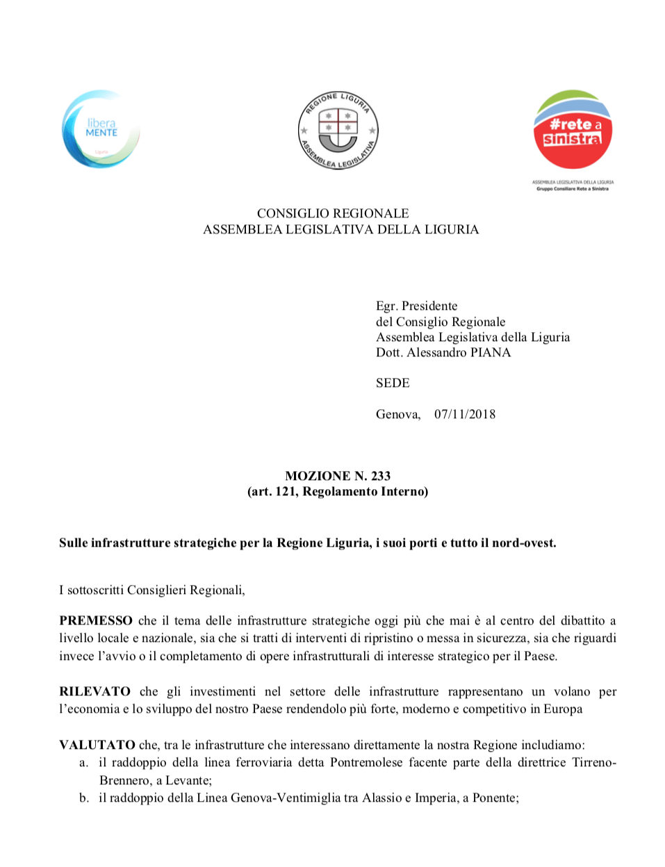 Genova – Ecco il testo della mozione n.233 “Sulle infrastrutture strategiche per la Regione Liguria, i suoi porti e tutto il Nord-Ovest” approvata all’unanimità nel Consiglio Regionale del 27 novembre scorso e attaccata da Alice Salvatore.