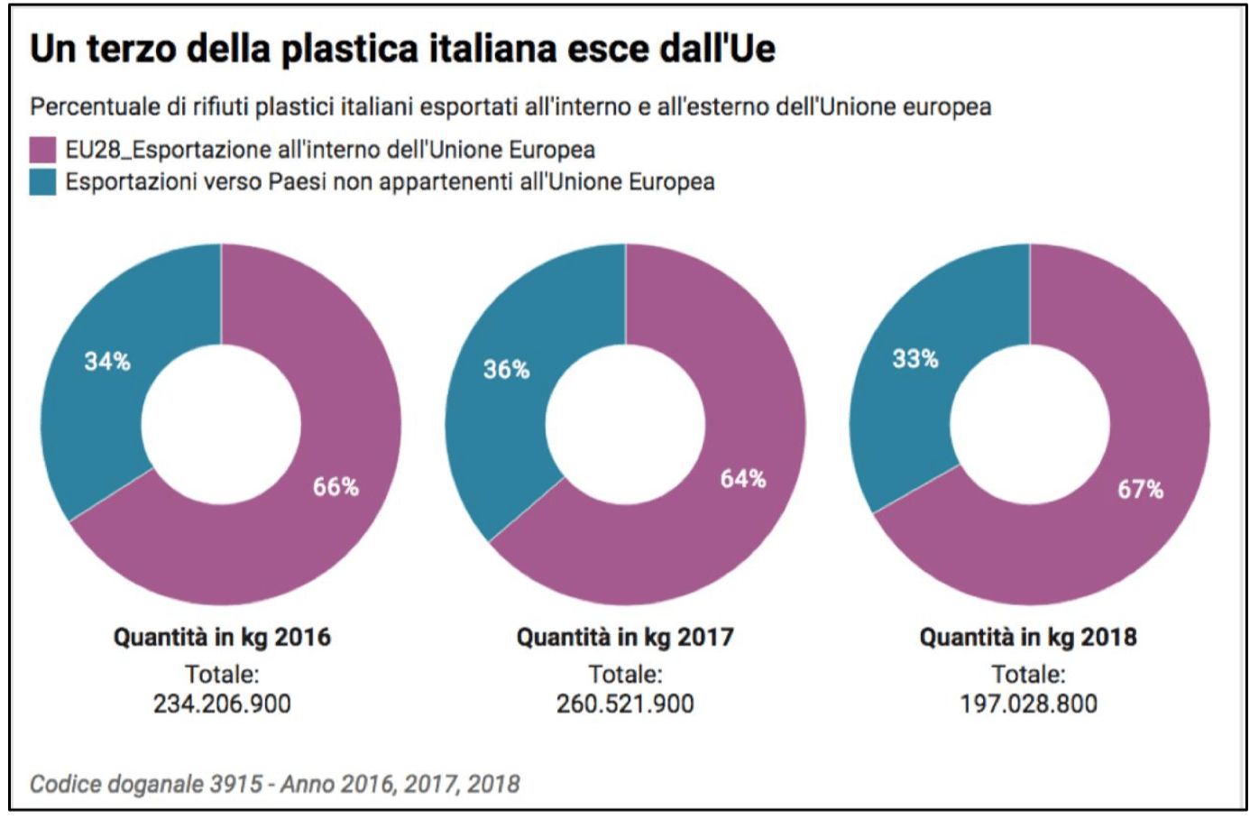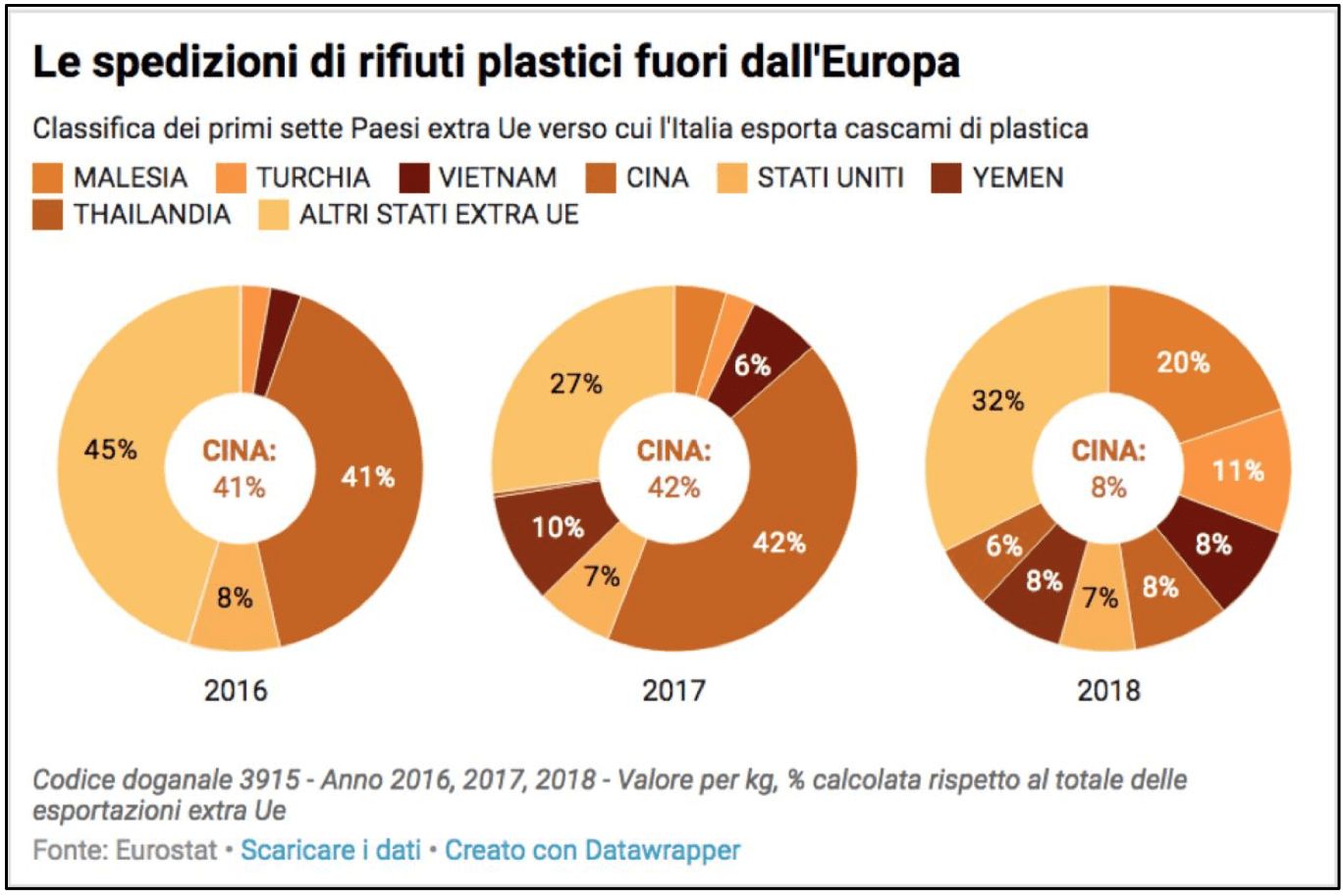Fino a quel momento, infatti, dall’Italia quasi un rifiuto plastico esportato su due era destinato proprio agli impianti cinesi. Dati Eurostat alla mano, sia nel 2016 che nel 2017, di tutti gli scarti plastici spediti fuori dall’Europa, il 42% circa è stato destinato al mercato cinese.