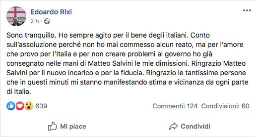 Quanto alla condanna del viceministro Edoardo Rixi, prendiamo atto delle sue dimissioni, che consideriamo un atto dovuto e ragionevole, considerato che chi svolge un ruolo di Governo ha il dovere di porre le istituzioni che rappresenta al di sopra di ogni sospetto. D’altra parte era difficile comportarsi diversamente, a fronte dell’entità delle condanna e dell’interdizione perpetua dai pubblici uffici.