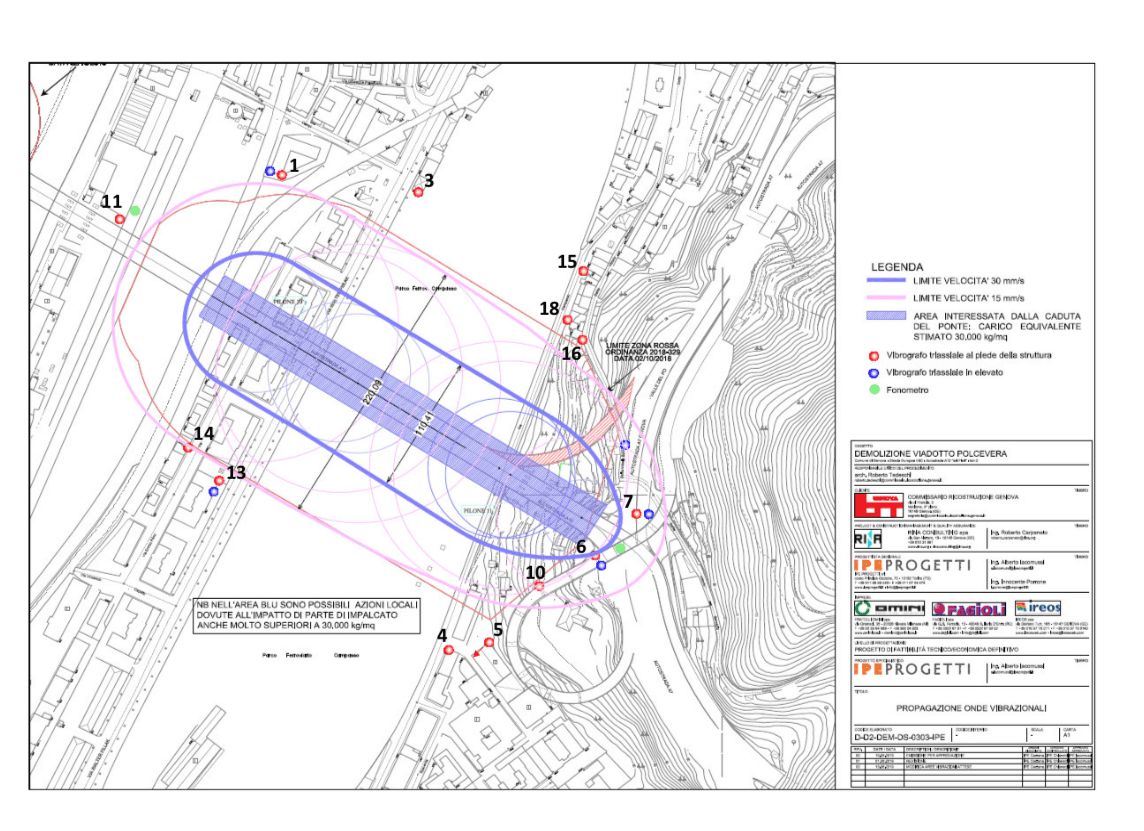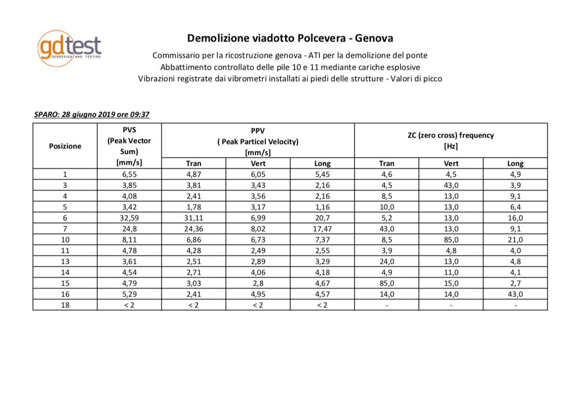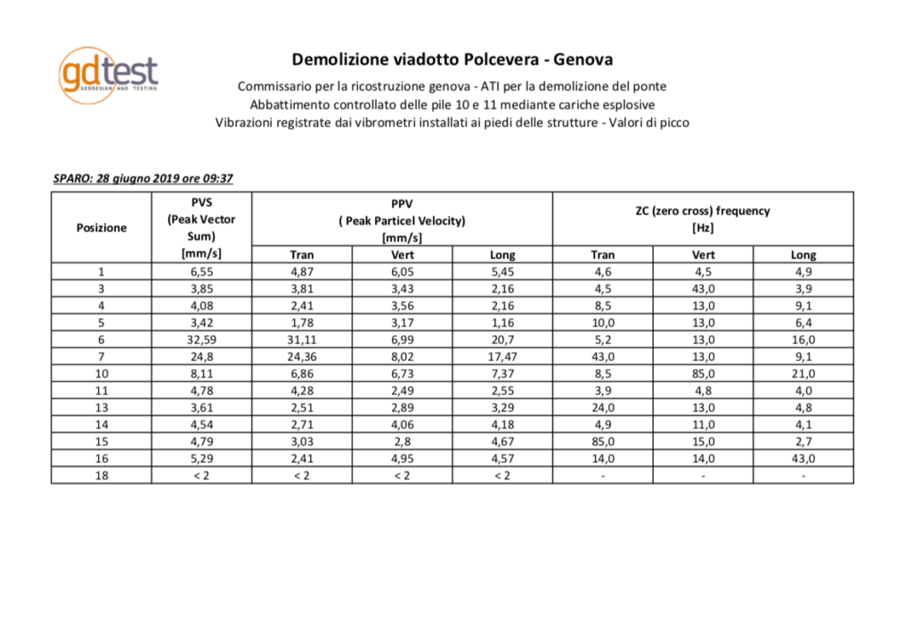 Genova – “I valori dei vibrometri, posizionati intorno all’area del crollo delle pile 10 e 11, hanno rilevato velocità a terra notevolmente inferiori alle attese grazie al notevole effetto smorzante dei cumuli predisposti dall’Ati demolitori.