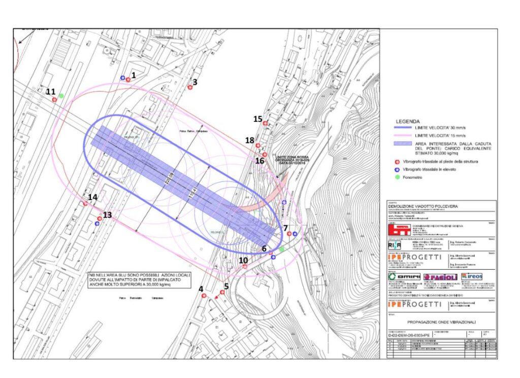 Lo studio che era stato fatto sulla propagazione delle onde si basava sui risultati che erano già stati effettuati in precedenza per sperimentare gli effetti di demolizioni tramite esplosivi. Da questa analisi era emerso che le vibrazioni si sarebbero smorzate prima di raggiungere i fabbricati vicini all’area interessata dal crollo delle pile 10 e 11. Cosa che è puntualmente avvenuta come previsto poiché, per controllare la corrispondenza tra quanto progettato e quanto avvenuto durante il crollo, erano stati posizionati numerosi vibrometri che avrebbero misurato le velocità effettive delle vibrazioni.