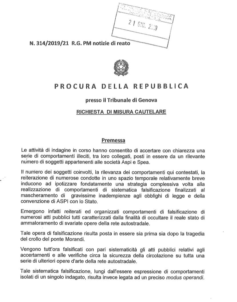 Una società come ASPI deve essere certa di aver ottemperato ai propri obblighi di manutenzione del viadotto. Evidentemente il dubbio che saltasse fuori qualcosa lo avevano, e infatti quel giorno furono convocati decine di ingegneri nella sede genovese di Spea, forse per lavorare a un progetto di ricostruzione del viadotto o forse per vedere se c’erano falle nelle carte.