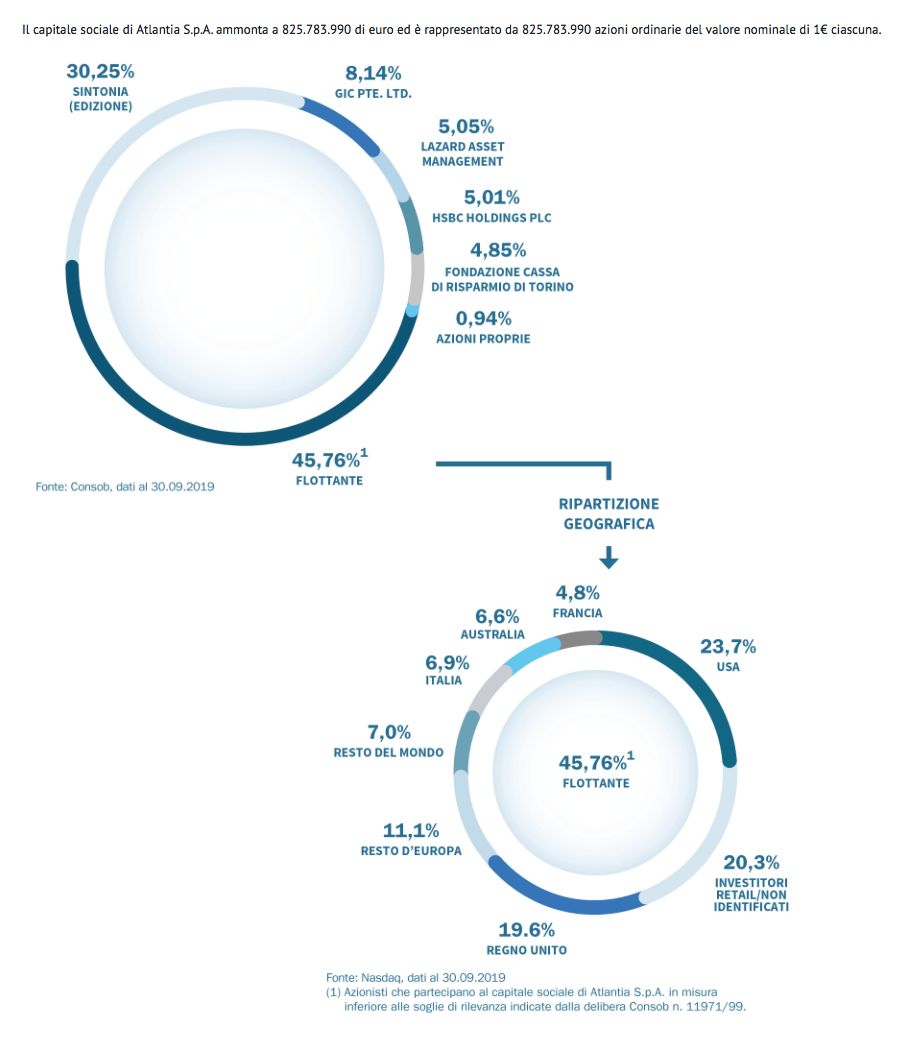 Oggi Autostrade è controllata al 100% da Atlantia S.p.A. di cui i Benetton detengono la maggioranza azionaria – il 30,25% – attraverso Sintonia S.p.A., subholding di Edizione S.r.l.“.