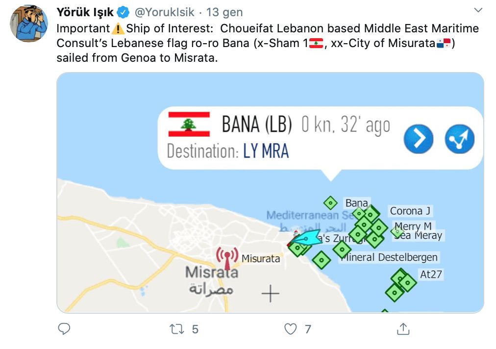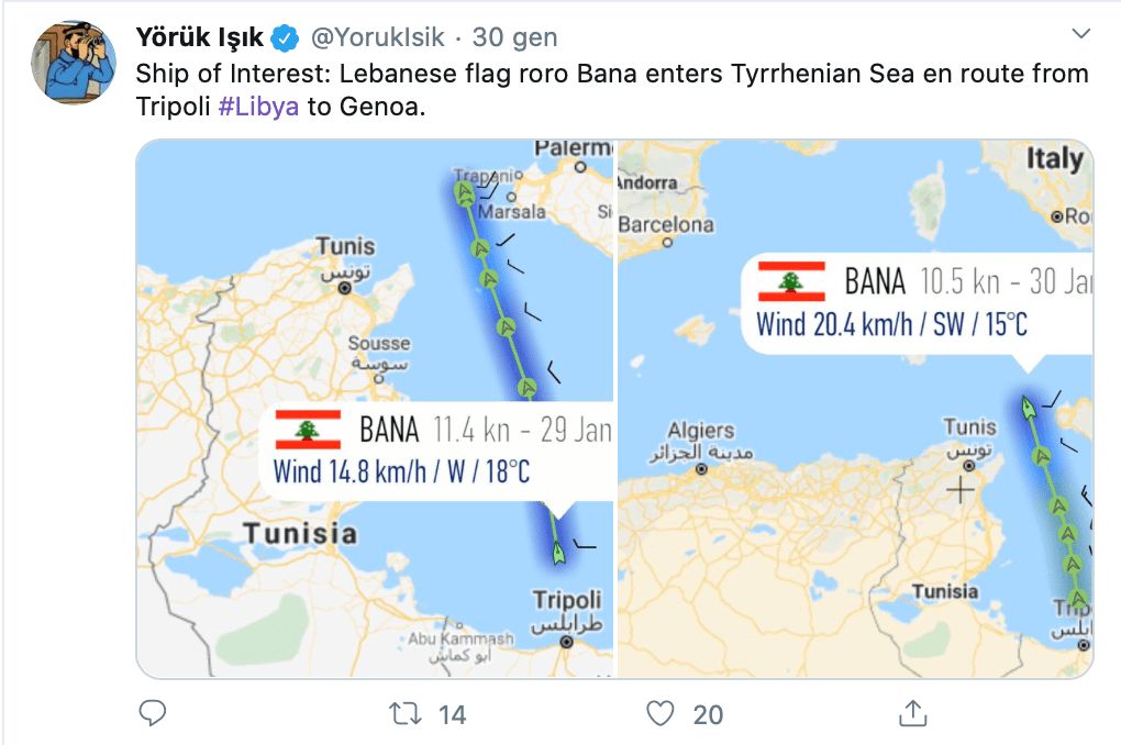 Genova – La chiamano la nave fantasma di Erdoğan e secondo il presidente francese Emmanuel Macron viaggia nel “Mediterraneo allargato” carica di armi e blindati turchi da consegnare a Tripoli, al governo di Fāyez al-Sarrāj. È il cargo Bana che batte bandiera libanese e fa la spola tra Genova e la Libia, o almeno questo è quanto registra Marine Traffic, il sito di monitoraggio marittimo che la indica ormeggiata da tre giorni al terminal Messina.