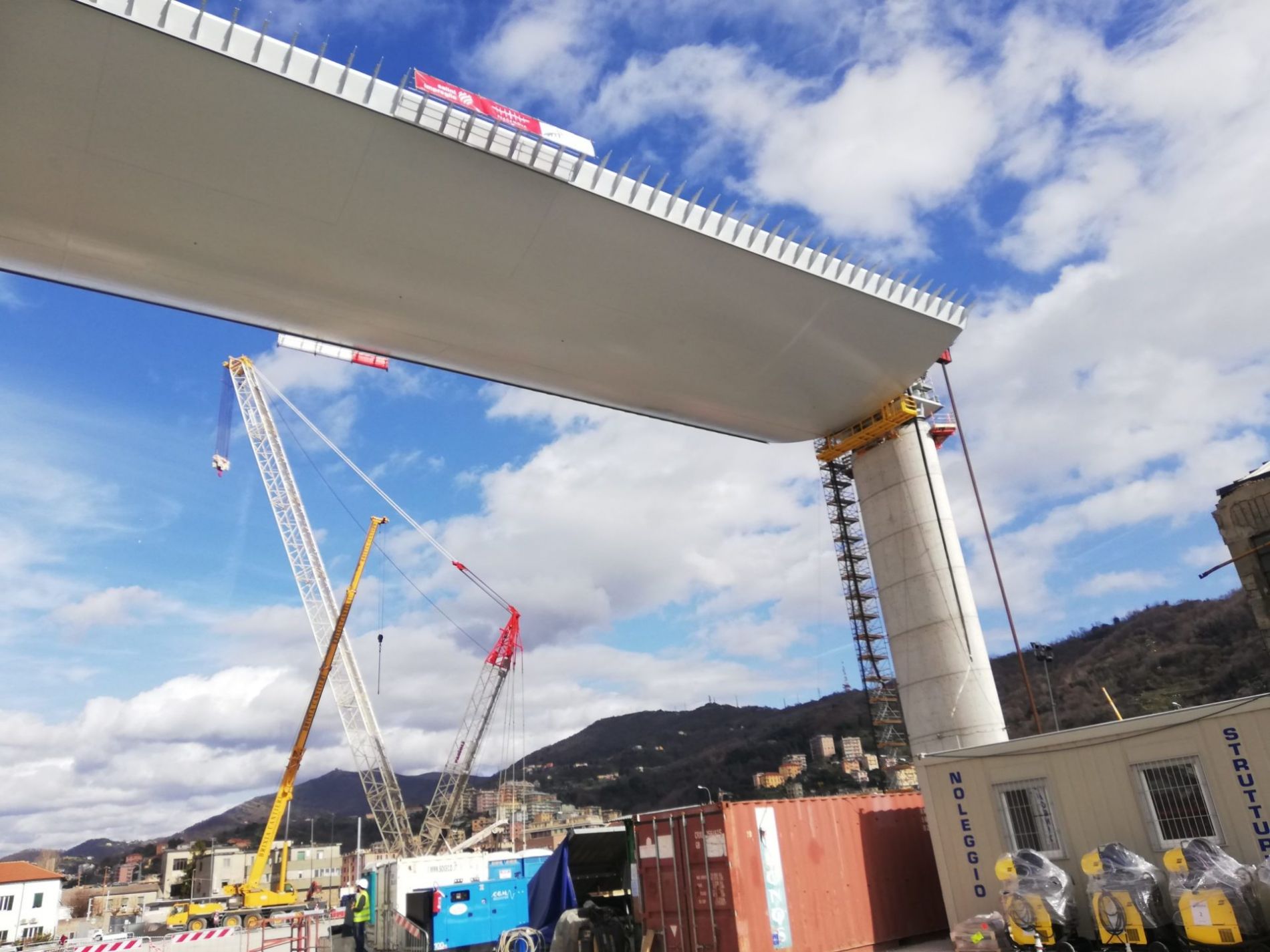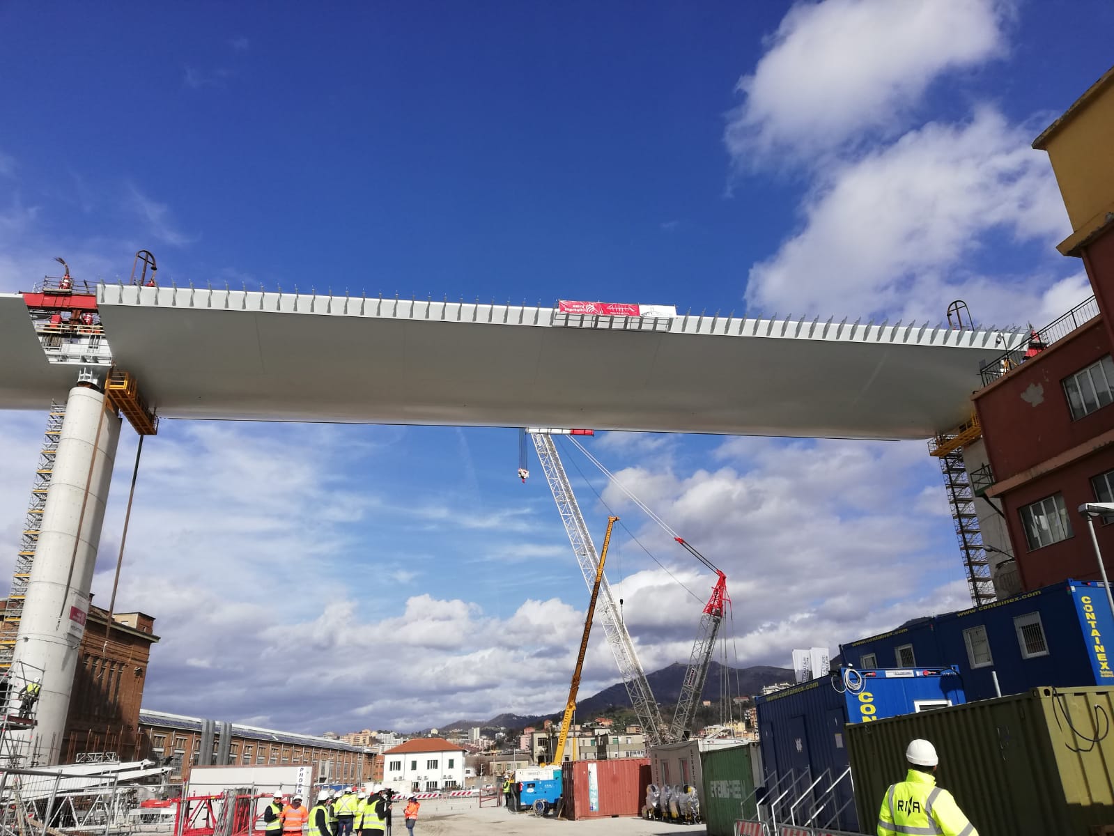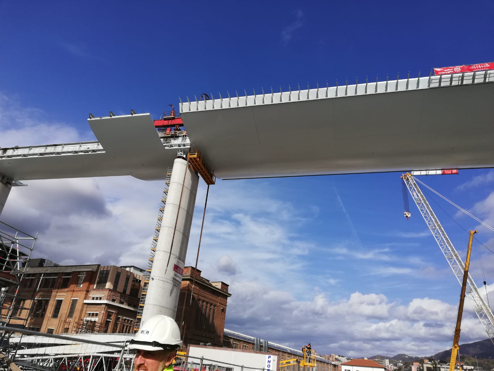 Genova – Si è concluso oggi, podo dopo le 14, il varo in quota della prima campata da 100 metri del nuovo viadotto Polcevera.