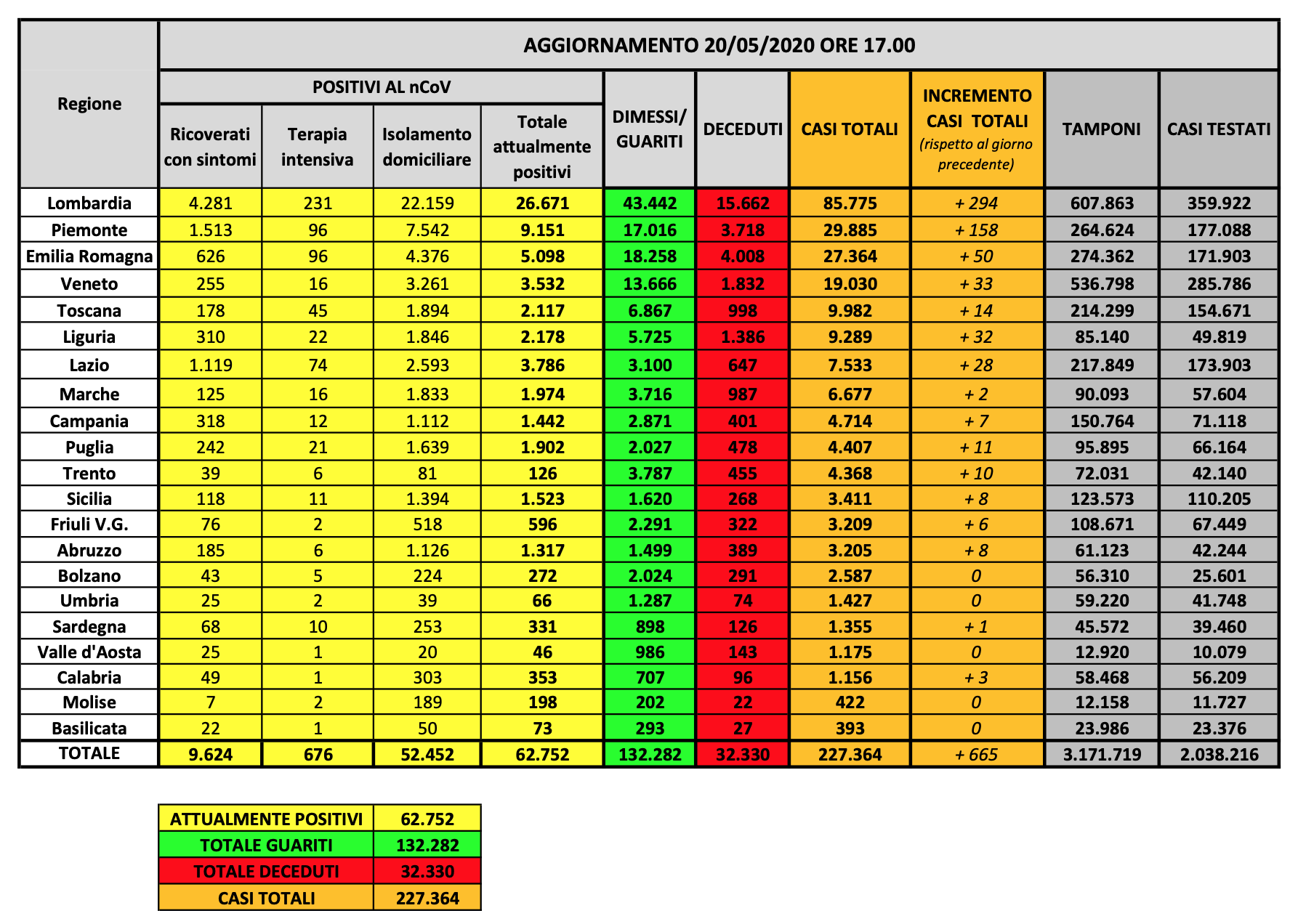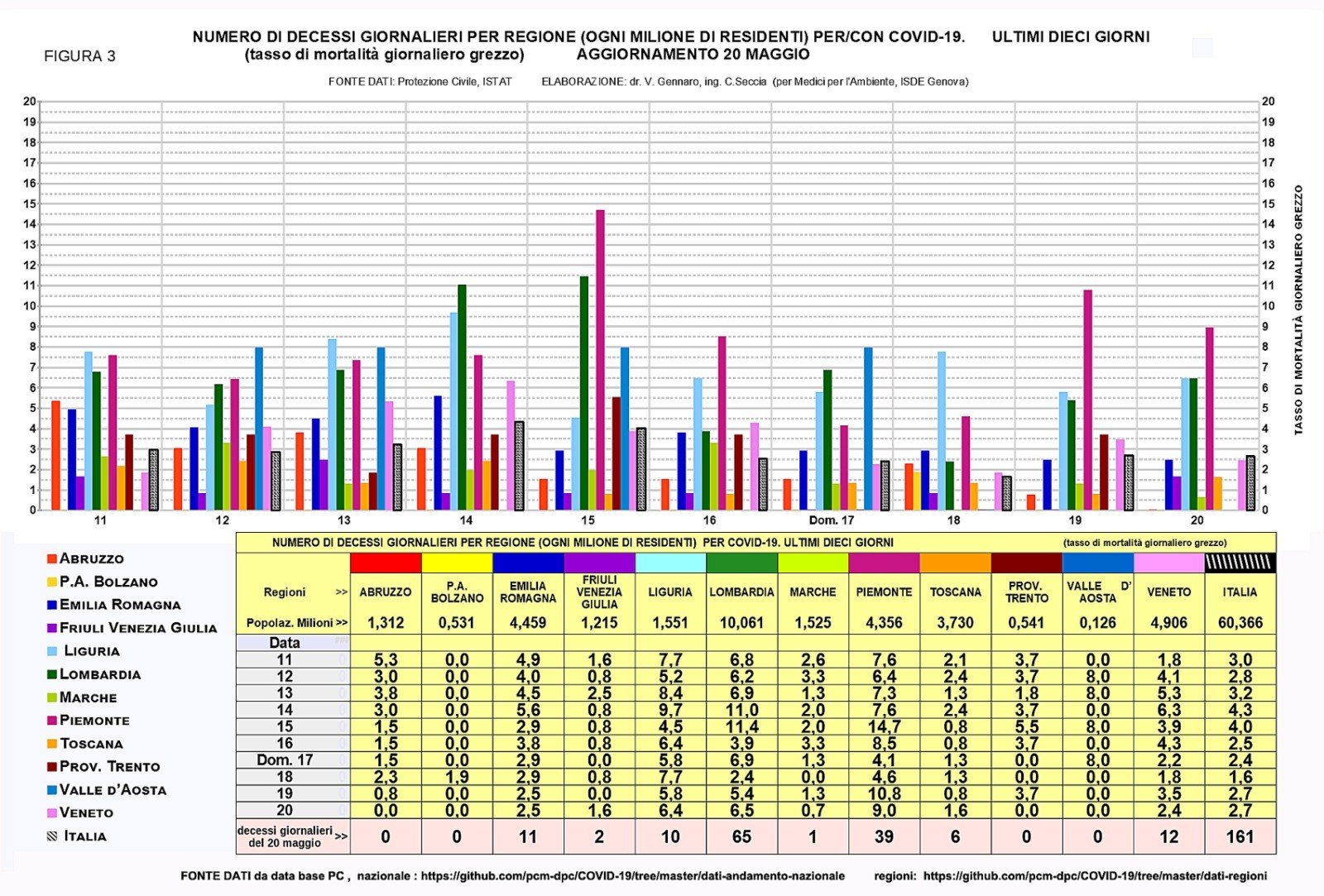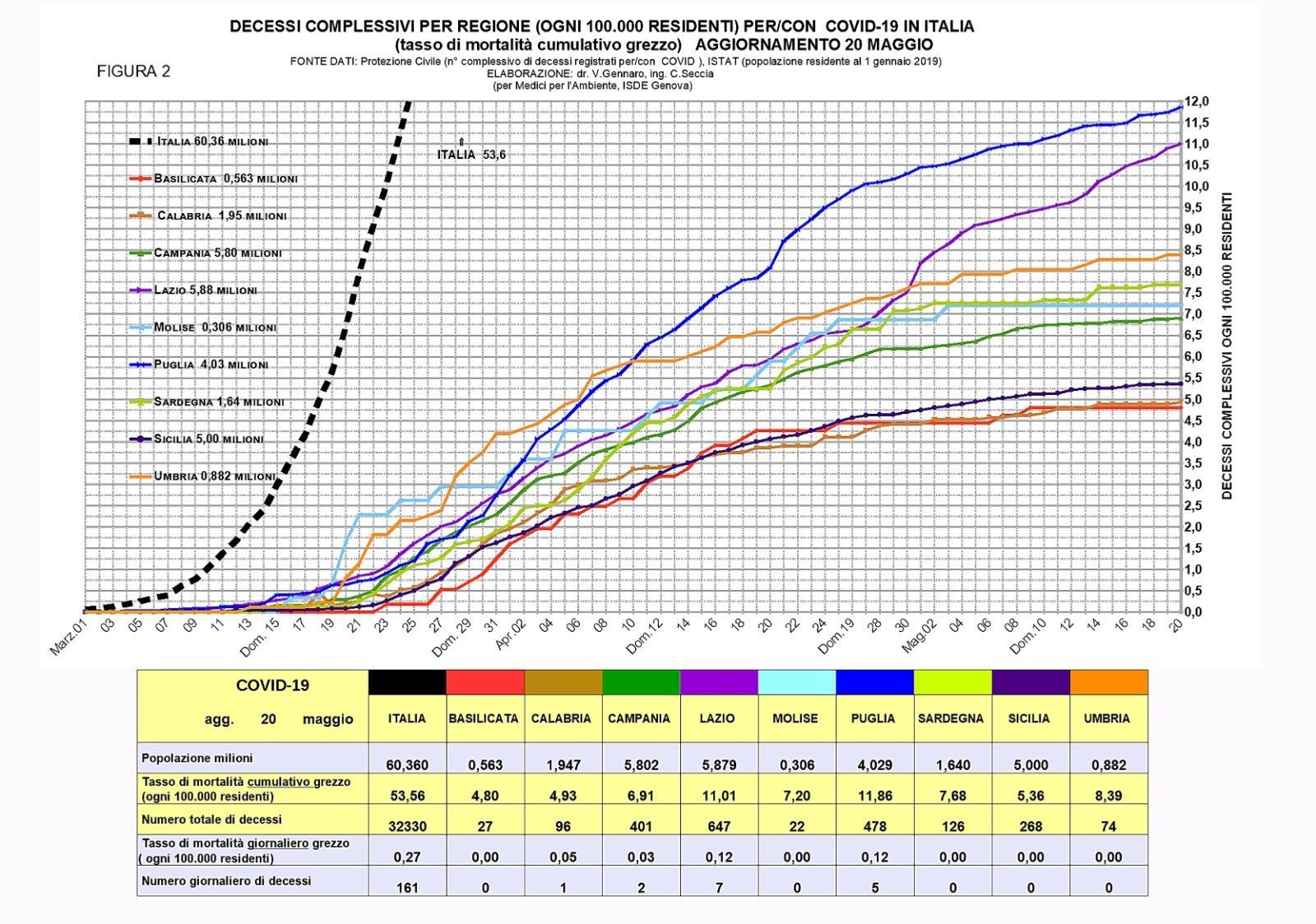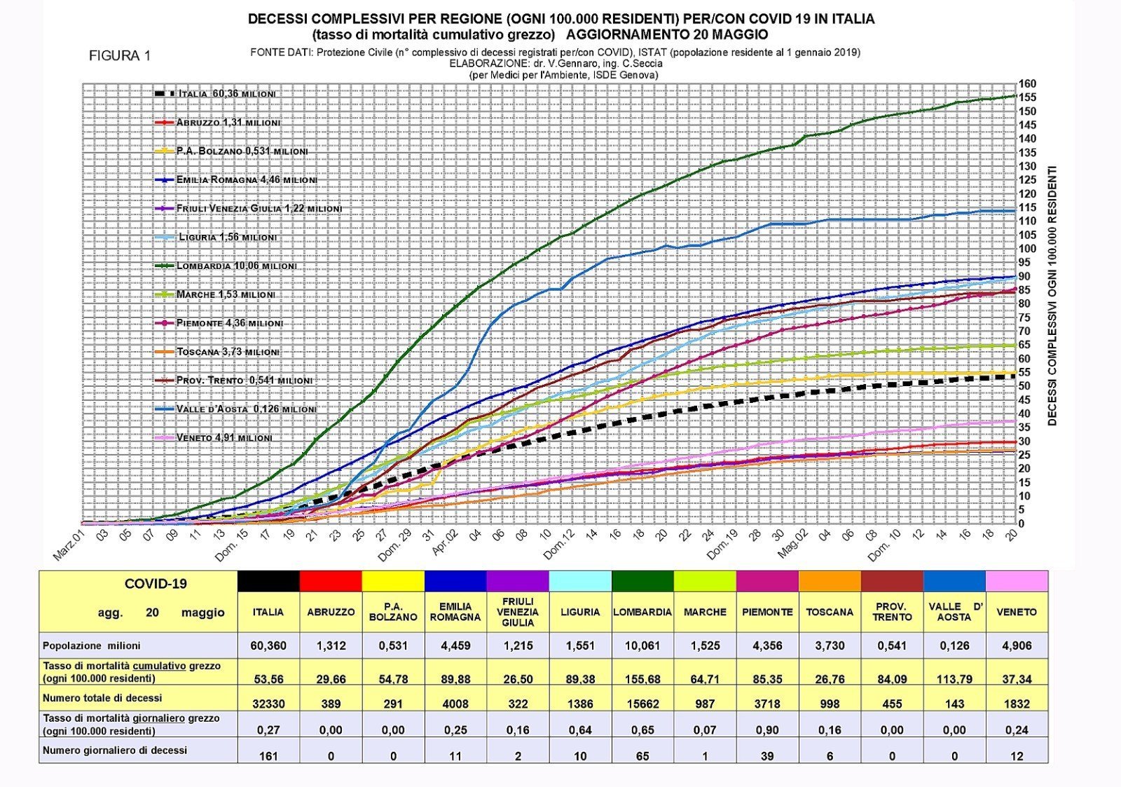 Stando ai dati della Protezione Civile e dell’ISTAT elaborati da Valerio Gennaro e Claudio Seccia di Medici per l’Ambiente (ISDE), sono otto, tra Regioni e Province Autonome, quelle che superano il dato nazionale del tasso di mortalità cumulativo grezzo (53 decessi ogni 100.000 residenti): al primo posto sempre la Lombardia (155), seguita da Valle D’Aosta (113), Emilia Romagna (89), Liguria (89), Piemonte (85), Trento (84), Marche (64) e Bolzano (54).