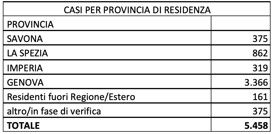In totale i positivi in Liguria, esclusi i pazienti guariti con due test negativi e quelli deceduti, sono 5.458 e cioè 369 più di ieri.