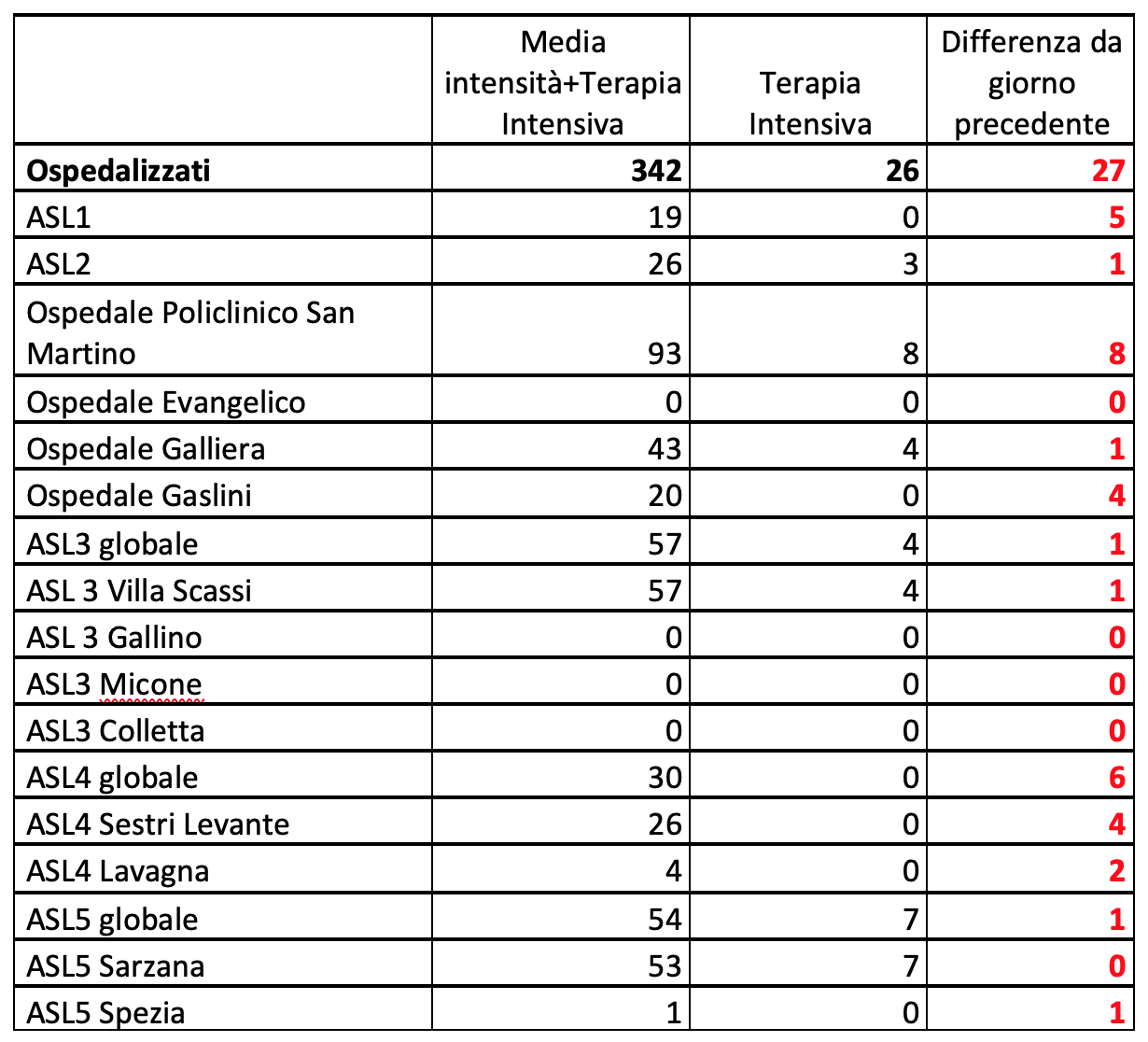 Si contano anche due decessi nelle ultime ventiquattr’ore: un uomo di 54 anni deceduto al pronto soccorso di San Remo e un uomo di 86 anni deceduto al pronto soccorso del San Martino di Genova.