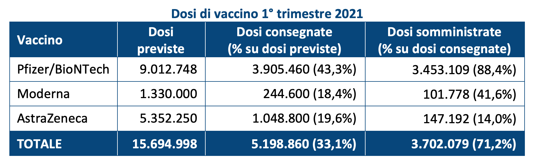 La continua revisione al ribasso, documentata dai 4 aggiornamenti ufficiali delle forniture attese, ha quasi dimezzato in soli due mesi le dosi previste dal Piano vaccinale per il primo trimestre 2021, che sono precipitate da 28,3 a 15,7 milioni.