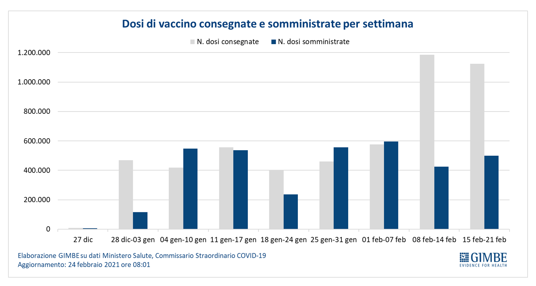 “Una riduzione di tale entità – commenta Nino Cartabellotta, Presidente della Fondazione Gimbe – se da un lato è imputabile ai ritardi di produzione e consegna da parte delle aziende, dall’altro risente di irrealistiche stime di approvvigionamento del Piano vaccinale originale». Inoltre, delle dosi previste per il primo trimestre 2021, al 24 febbraio (aggiornamento ore 08.01) ne sono state consegnate alle Regioni solo un terzo: per rispettare le scadenze nelle prossime 5 settimane dovranno essere consegnate in media 2,3 milioni di dosi/settimana.