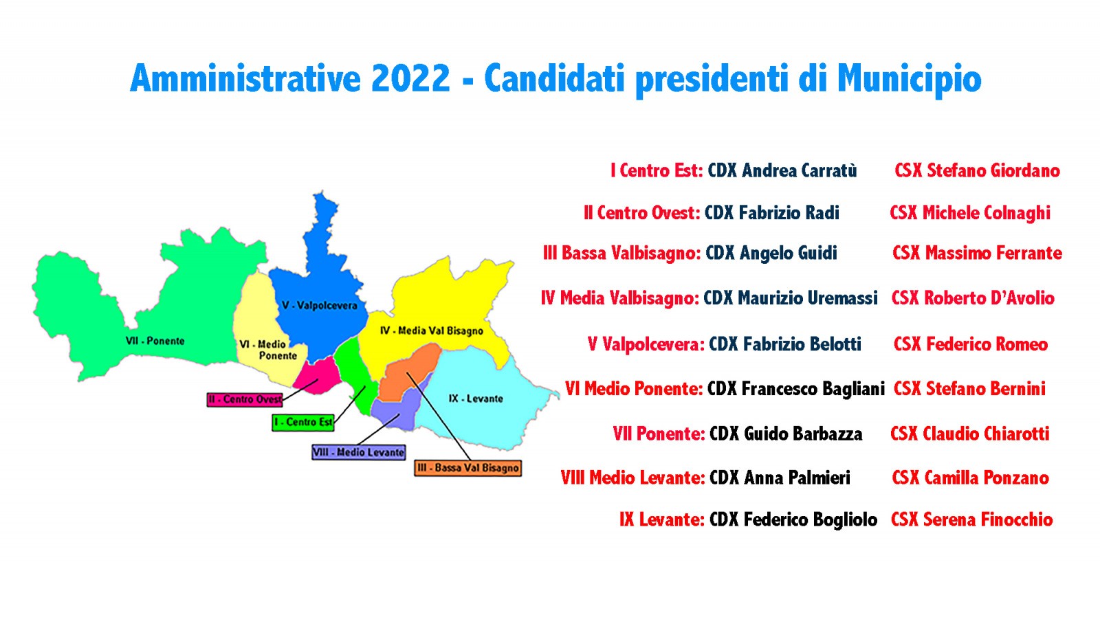 Sul fronte del Sindaco in carica, le ultime indiscrezioni danno come nomi degli sfidanti in pole quello della consigliera municipale di Fratelli d’Italia Anna Palmieri per il Medio Levante, di Federico Bogliolo, già candidato alle elezioni regionali con la lista Toti Presidente, che ci prova con il Levante, di Angelo Guidi per la Bassa Valbisagno, dell’attuale consigliere municipale della lista Toti nel Levante, Maurizio Uremassi, che è in corsa per la Media Valbisagno, di Fabrizio Radi, già assessore del parlamentino guidato dal commissario Renato Falcidia, per il Centro Ovest e di Francesco Bagliani per il Medio Ponente.