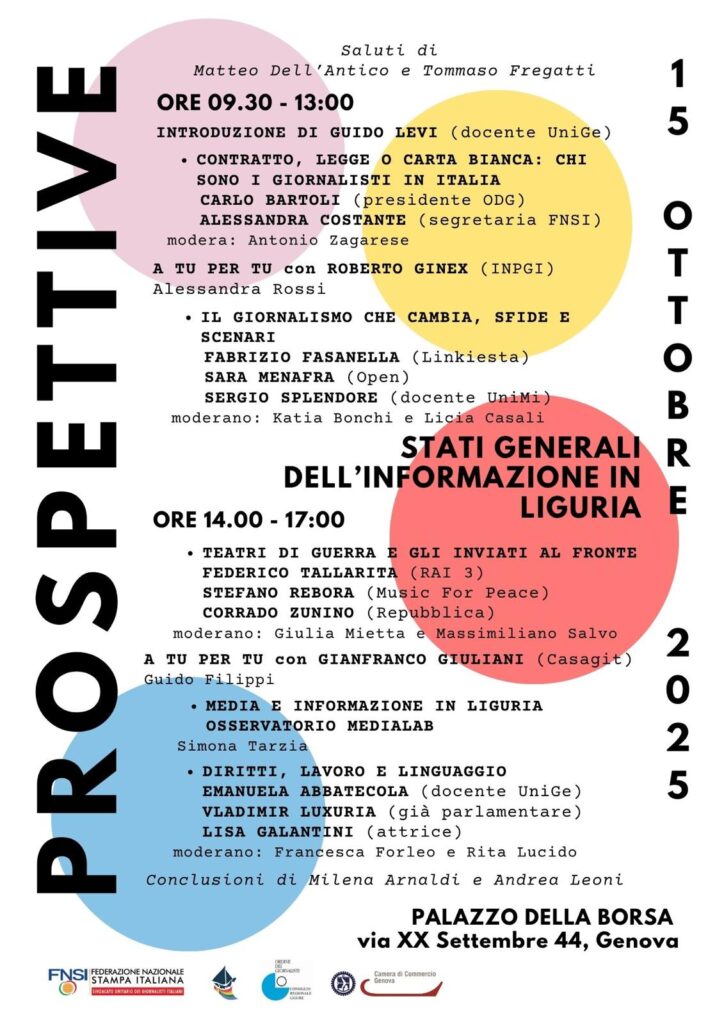 “Con questo appuntamento – dicono Matteo Dell’Antico (segretario Associazione Ligure dei Giornalisti) e Tommaso Fregatti (presidente Ordine Ligure dei Giornalisti) – vogliamo mettere al centro la figura di chi oggi fa informazione non senza innumerevoli problemi e criticità. È un appuntamento che vuole guardare anche e soprattutto al futuro di una professione in continua evoluzione, sia per chi lavora nelle redazioni ma anche per i moltissimi collaboratori troppo spesso sottopagati e sfruttati. Un sincero ringraziamento va a tutte le colleghe e i colleghi del Sindacato e dell’Ordine che da mesi stanno lavorando a questo evento assieme ai nostri uffici”.